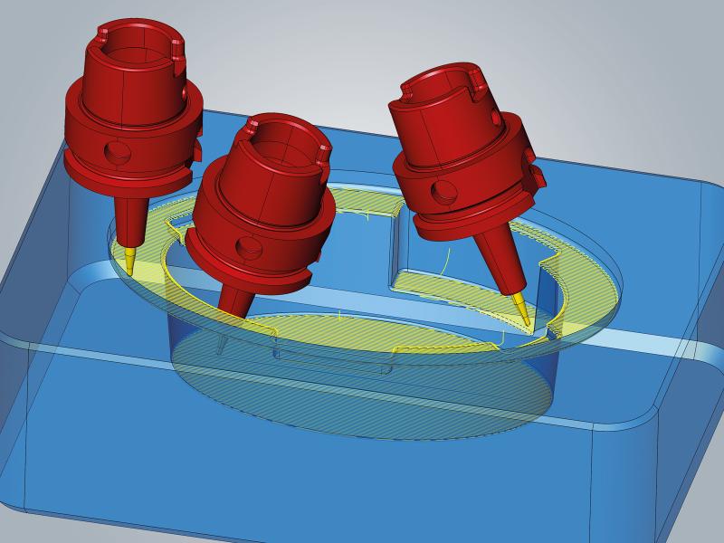 Dank der Voranalyse des gesamten Werkzeugwegs berechnet der neue 5-Achs-Algorithmus in hyperMILL eine optimale Bearbeitungsabfolge von simultanen und indexierten Werkzeugbewegungen. Die Wahl der bevorzugten, weil schnelleren, indexierten Bearbeitung und der Simultanbearbeitungsphasen erfolgt automatisch. Die neue Strategie 5-Achs-ISO-Bearbeitung erlaubt es, Flächen nach dem Verlauf der ISO-Linien (U und V) zu bearbeiten. Neben der Vorschubanpassung bei Krümmungen und einer 3D-Radiuskorrektur lässt sich hier ein neuer hochgenauer Flächenmodus mit einer homogenen Punkteverteilung nutzen. Der steht auch im 5-Achs-Profilschlichten für Flächen- und Kavitätenbearbeitung zur Verfügung. Beide Strategien sind Adaptionen bewährter 3D-Techniken.